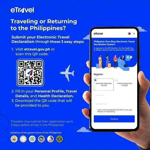 - eTravel Registration: All travelers must complete the eTravel digital declaration card within 72 hours (3 days) prior to your arrival into or departure from the Philippines.